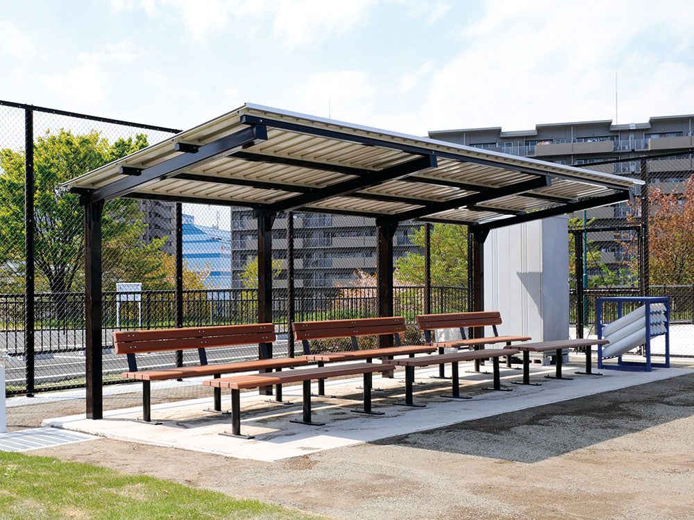 ◇柱・梁:□100×100×3.2 ◇母屋:□-50×50×2.3 ◇屋根:アルミ耐食合金製 WSパネル連結張り ◇ベンチ:座 オレンジウッド・脚:FB-9×75 φ60.5×3.8