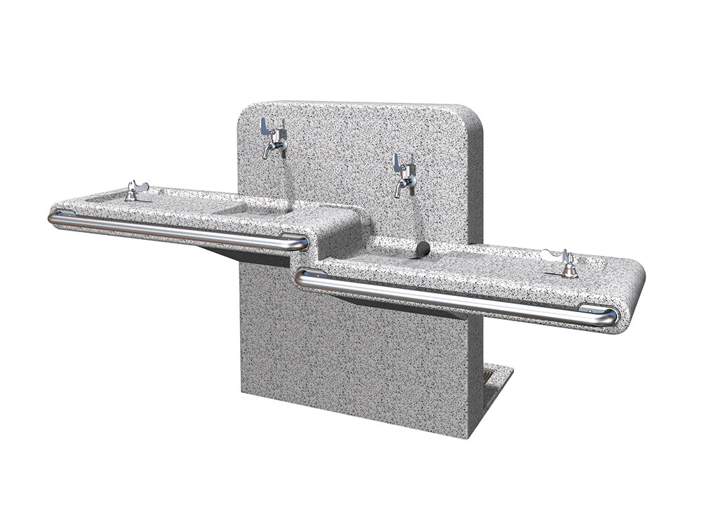 ◇本体:人造石ブラスト仕上 ◇水栓:レバー式立水栓 2個、 レバー式横水栓 2個 ◇レバー式手洗水栓 2個 ◇手摺:ステンレスパイプ ◇グレーチング:鋼製 亜鉛メッキ仕上
