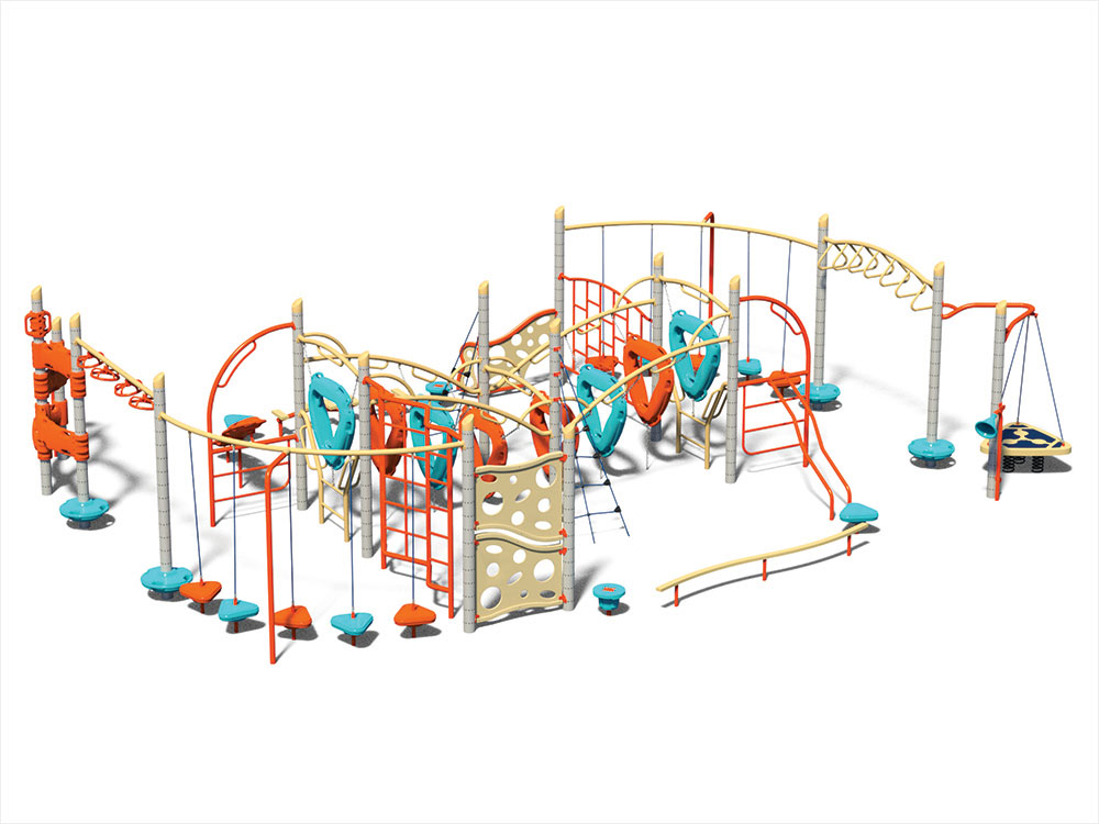 ◇メインポスト:φ88.9×t3.0 亜鉛メッキ鋼管+アルミダイカスト製スリーブ ◇デッキ:t2.6鋼板(パンチング) PVCコーティング ◇柵:スチール亜鉛メッキ鋼管 ◇クライマー:ポリエチレン回転成型品 ◇パネル:ポリエチレン樹脂製 ◇ロープ:鋼芯材入ロープ
