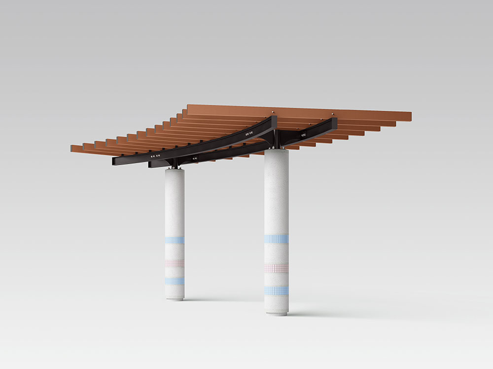 | 仕様 | ◇柱:φ350 擬石ビシャン仕上 モザイクタイル貼 ◇桁:H-150×75×5×7電気亜鉛メッキ 合成樹脂塗装仕上 ◇桟木:123×50オレンジウッド(アルミ芯材入り) |