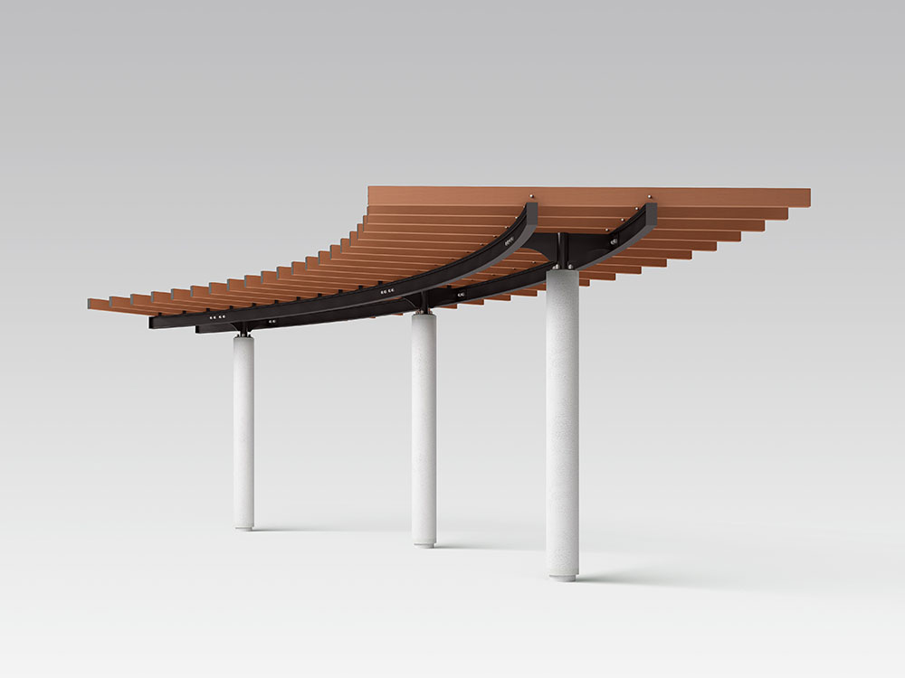 | 仕様 | ◇柱:φ250擬石ビシャン仕上 ◇桁:H-150×75×5×7電気亜鉛メッキ 合成樹脂塗装仕上 ◇桟木:123×50オレンジウッド(アルミ芯材入り) |